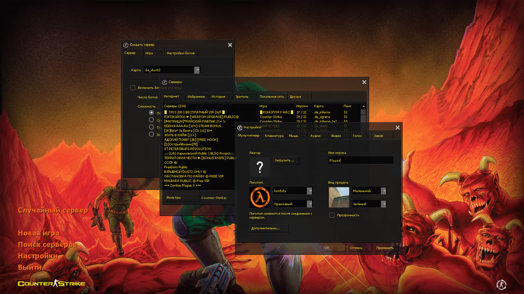 Все текстуры карт переработаны под стиль Dust в адском. Обновленная музыка, новые звуки, текстура карт не оставят равнодушным любителя Doom, но так же запомнятся и полюбятся классическим игрокам в контру, оставляя незабываемые эмоции и визуальные удовольствия от игры. Так же все базовые преимущества Counter-Strike остаются неизменными. Открытые онлайн игры в более чем 400+ серверах, закрытые оффлайн сессии с ботами, полностью русский интерфейс с русскими никами и русифицированным чатом.