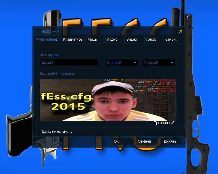 При входе в кс вы заметите заставку fess pro, созданную самим автором. Сборка была оформлена в синих цветах с небольшими дополнениями. Окно настроек имеет светло-синий, прозрачный цвет. Прямо в настройках установлен возможность создания идеального прицела. Все настройки были сохранены, вы сможете сменить ник, бинды, чувствительность мышки и провести другие настройки.